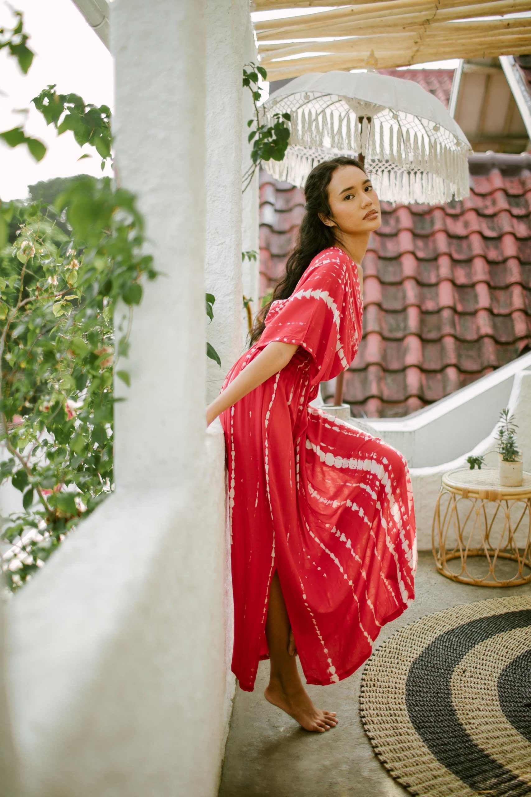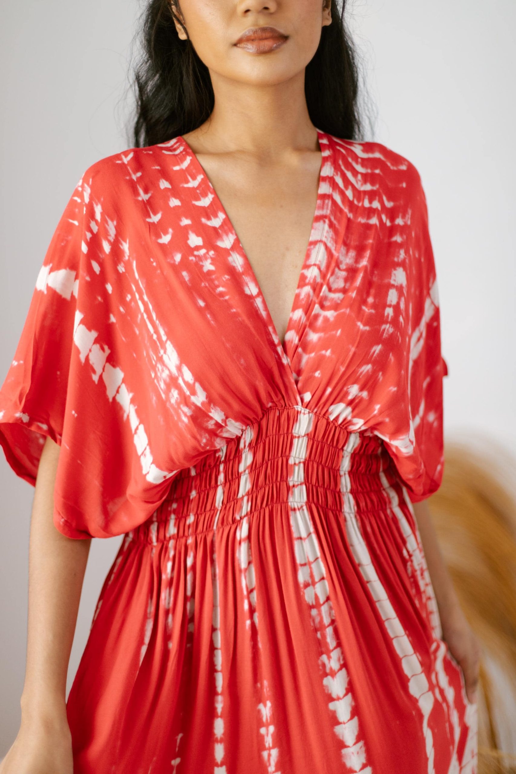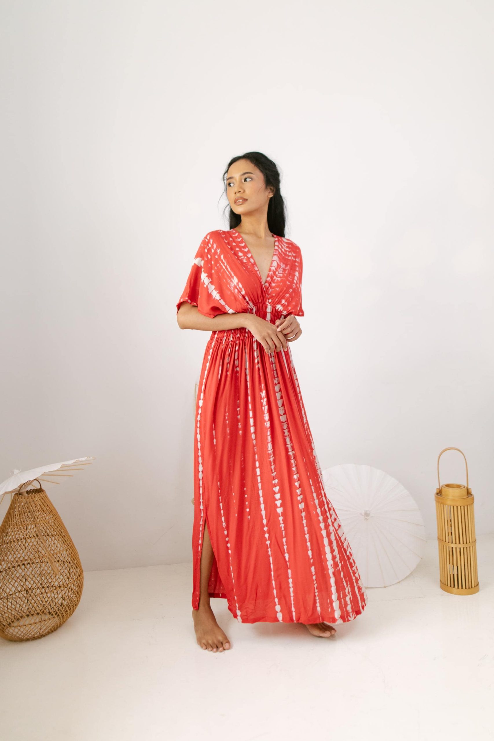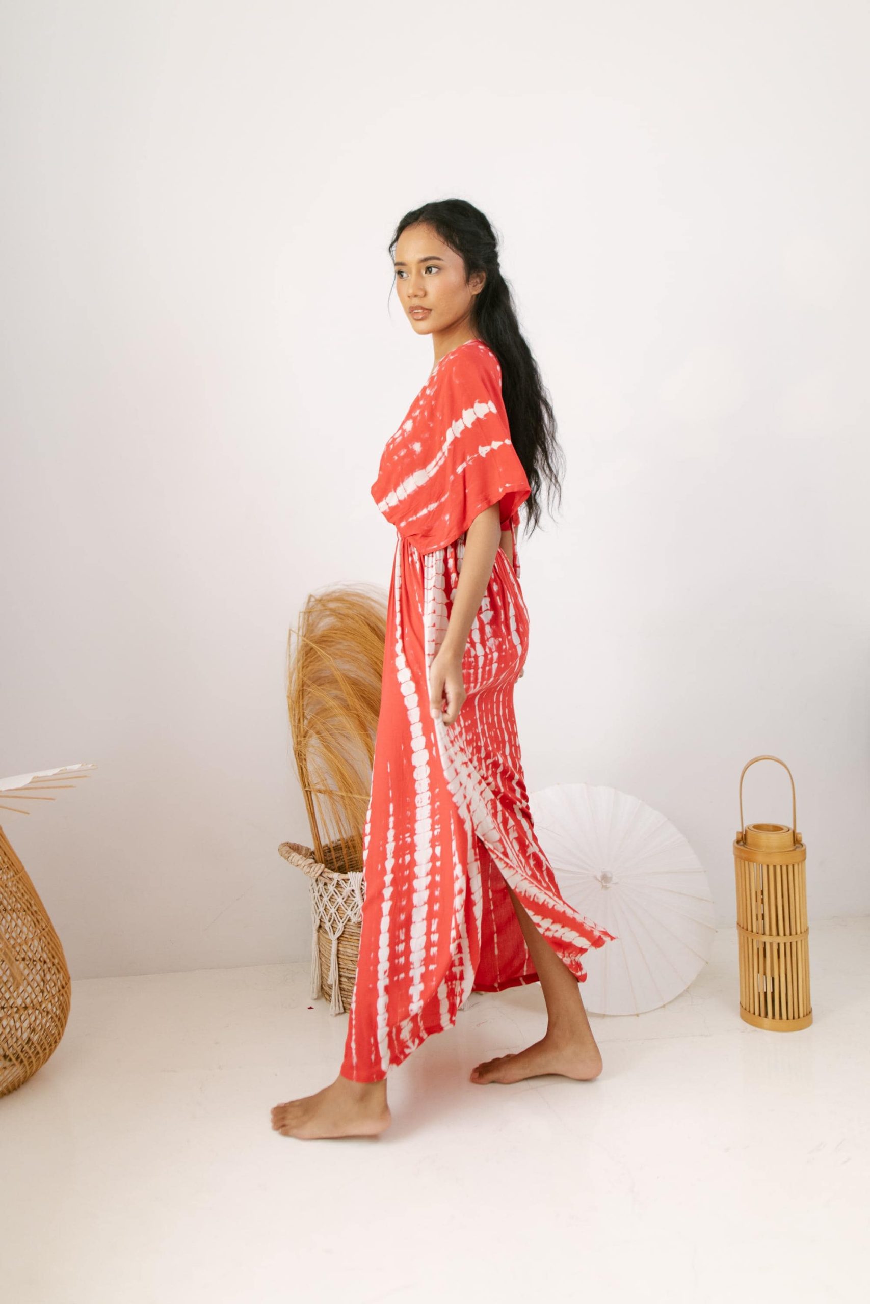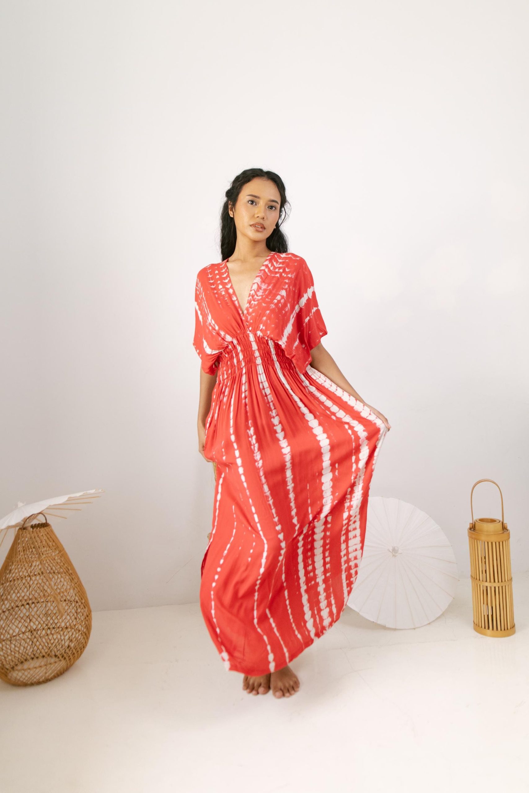 This elegant kaftan can be worn from day to night, from beach to dinner. Add bohemian accessories to add style and signature to your look. Made in tropical islands of Indonesia, the tie dye fabric is handmade brings tropical breeze to your holiday.