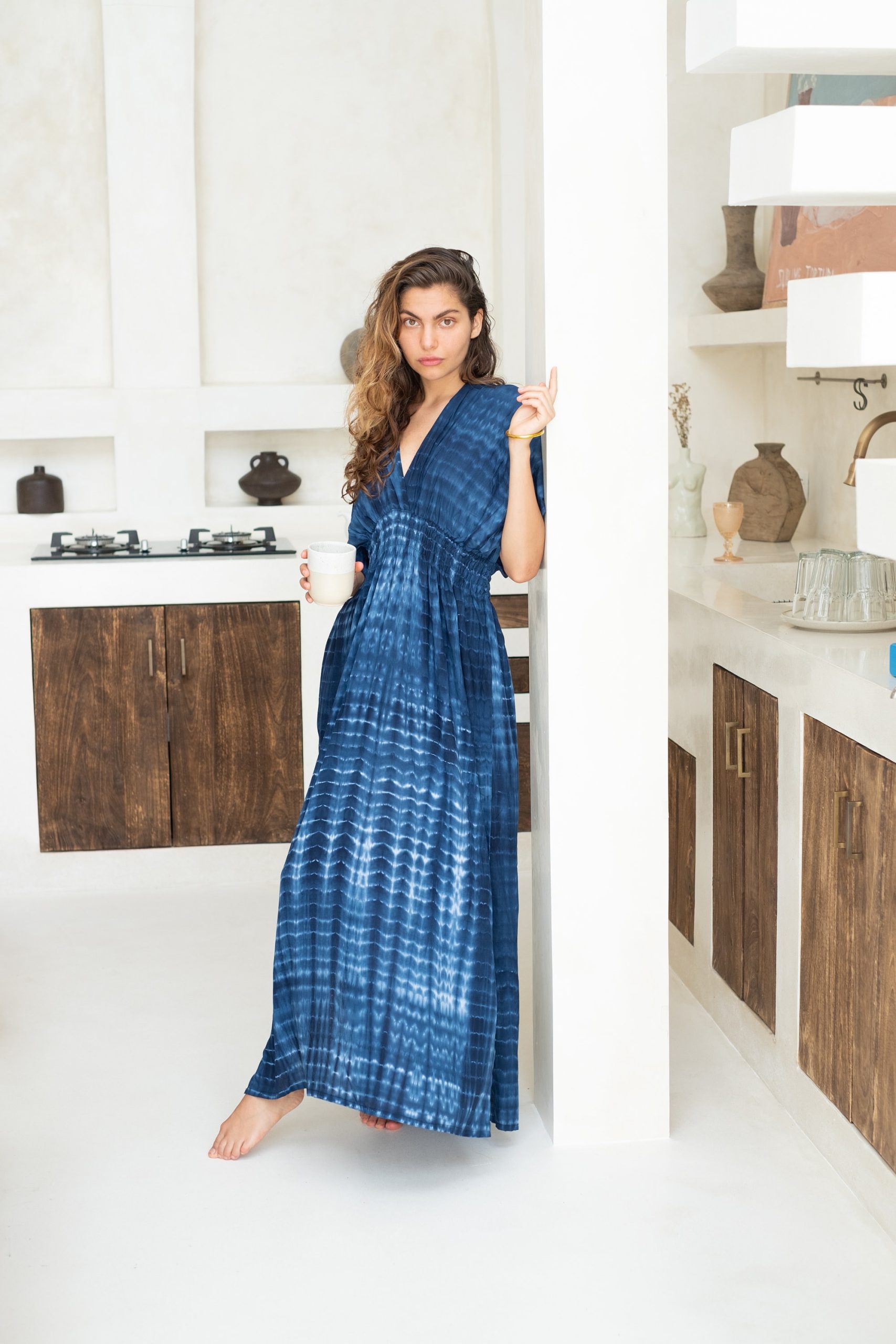 This elegant kaftan can be worn from day to night, from beach to dinner. Add bohemian accessories to add style and signature to your look. Made in tropical islands of Indonesia, the tie dye fabric is handmade brings tropical breeze to your holiday.