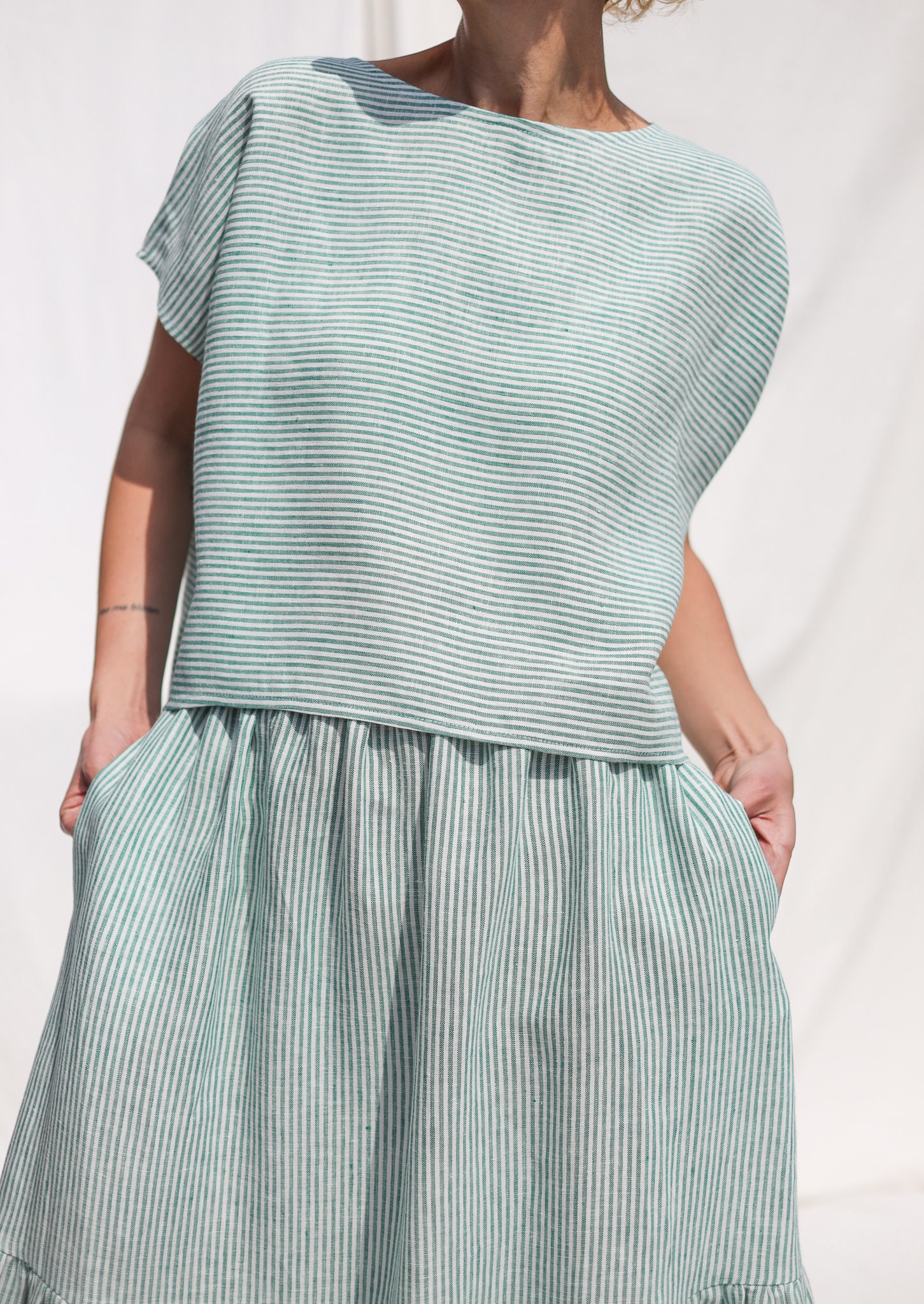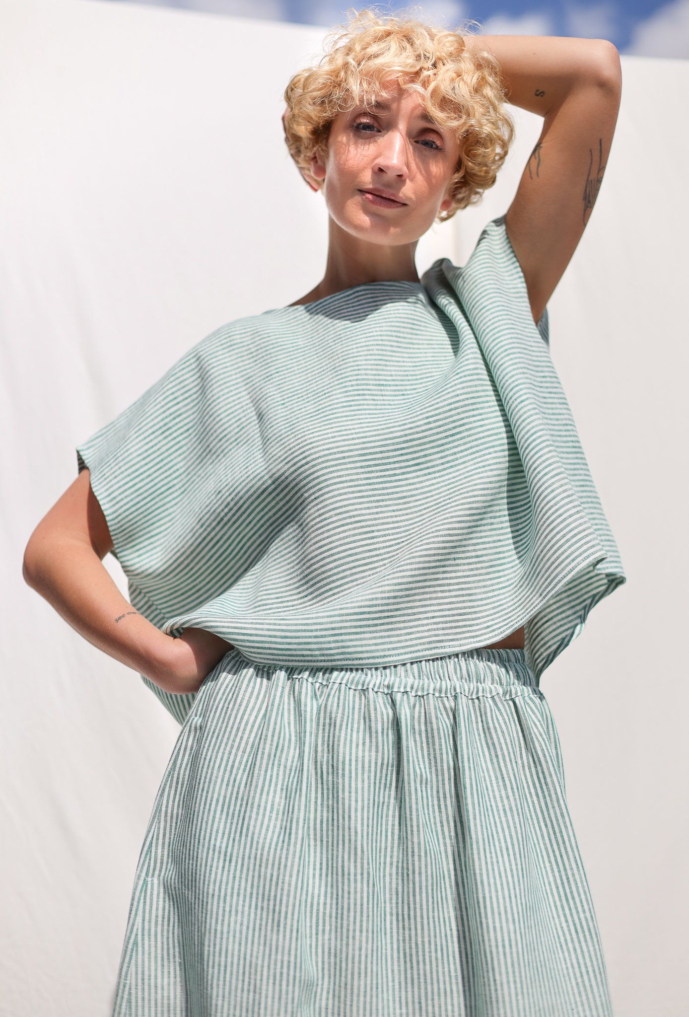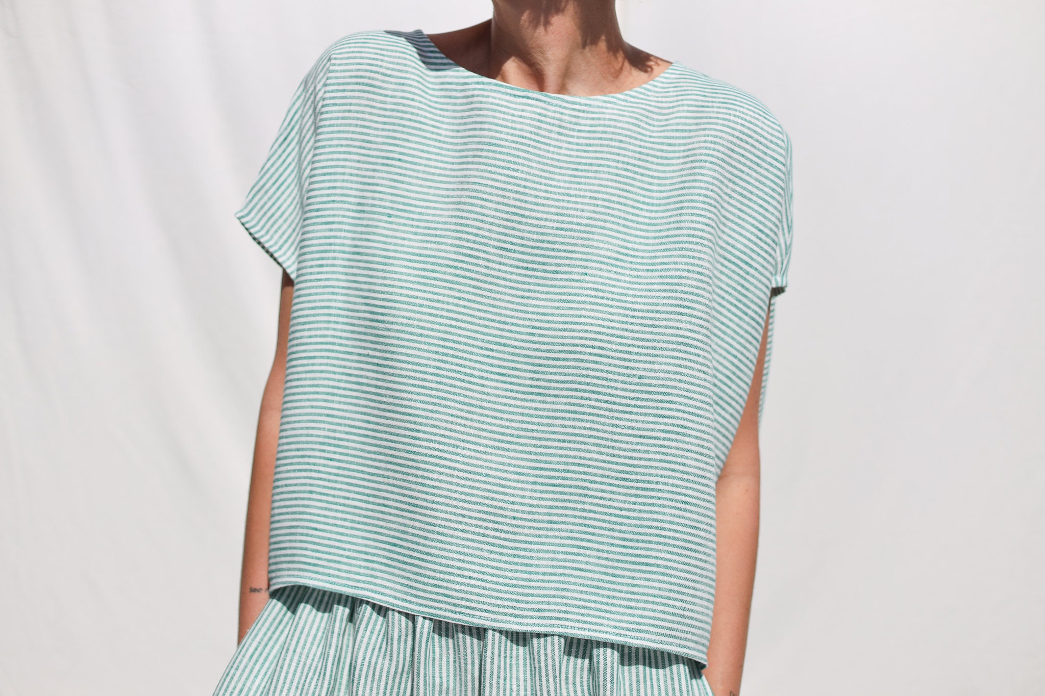 Styling tip: pair with the matching linen culottes or ruffed hem skirt.