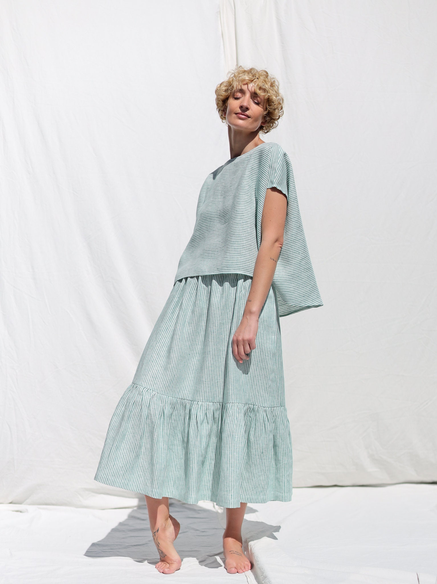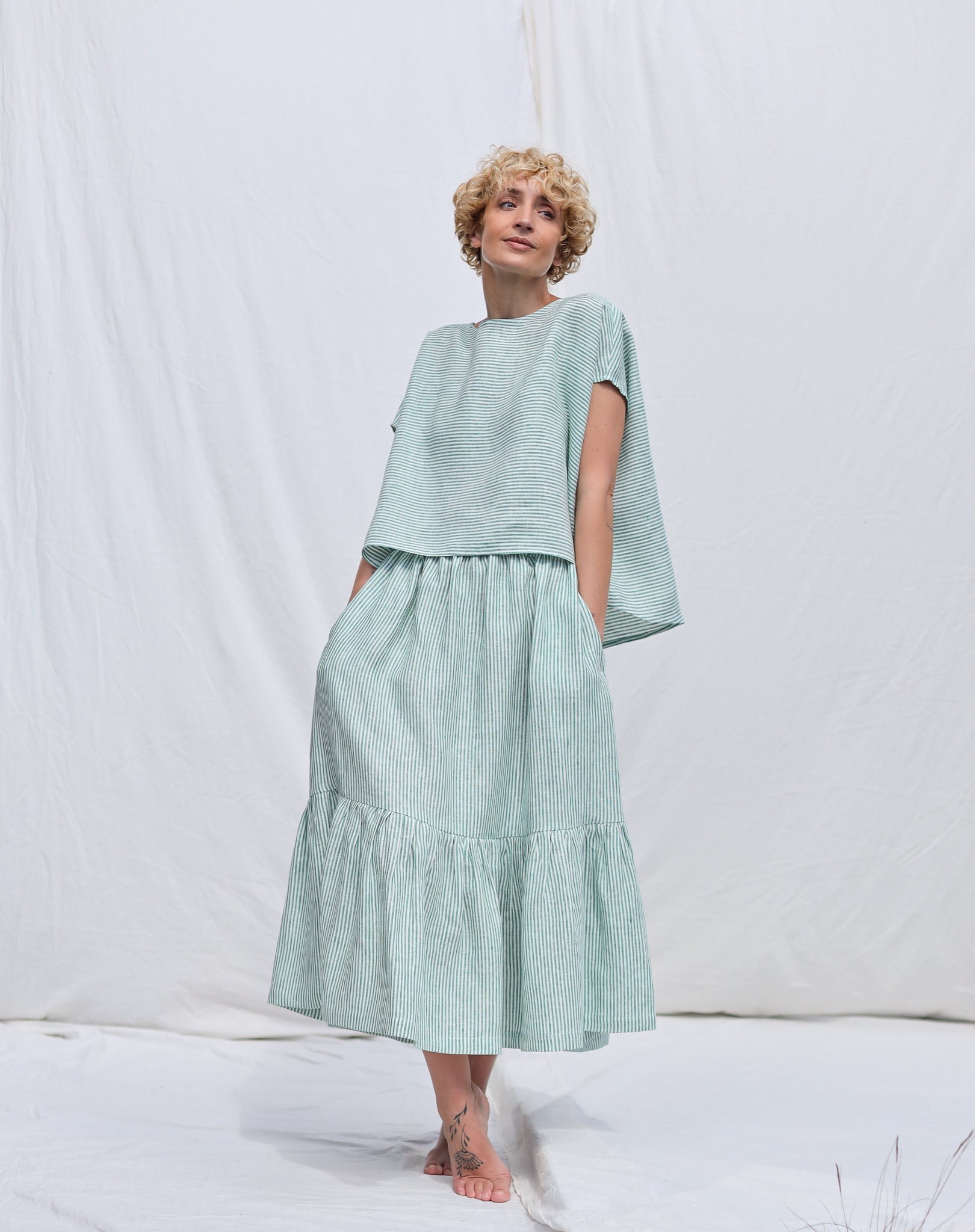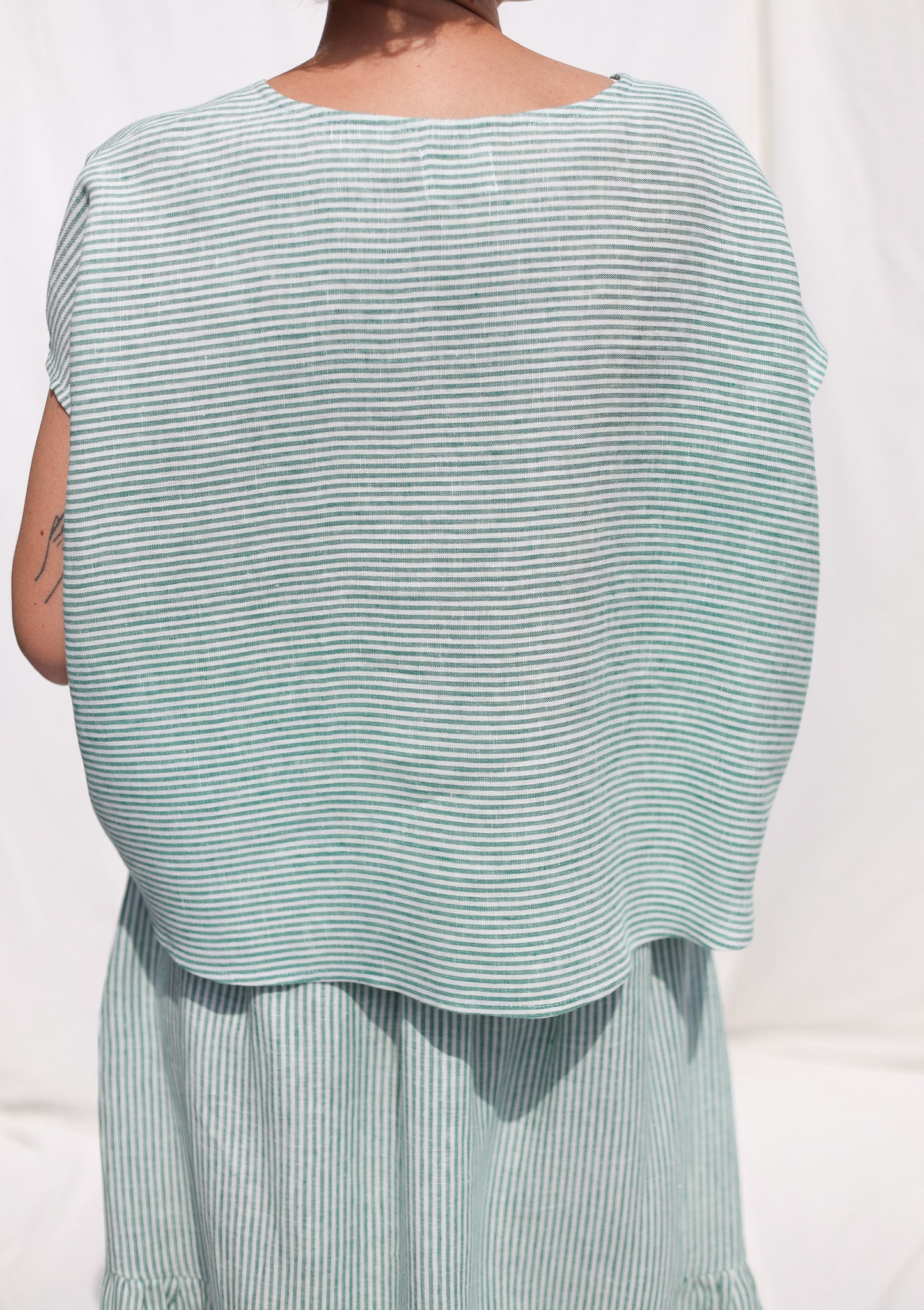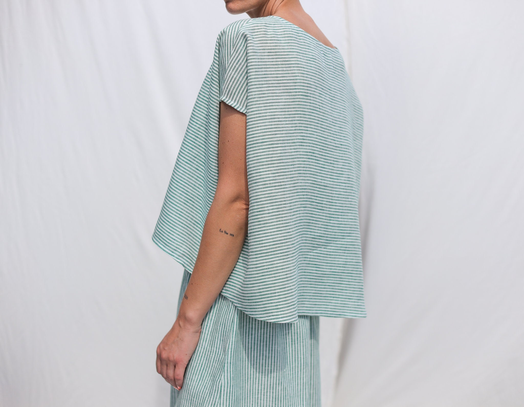 Styling tip: pair with the matching linen culottes or ruffed hem skirt.