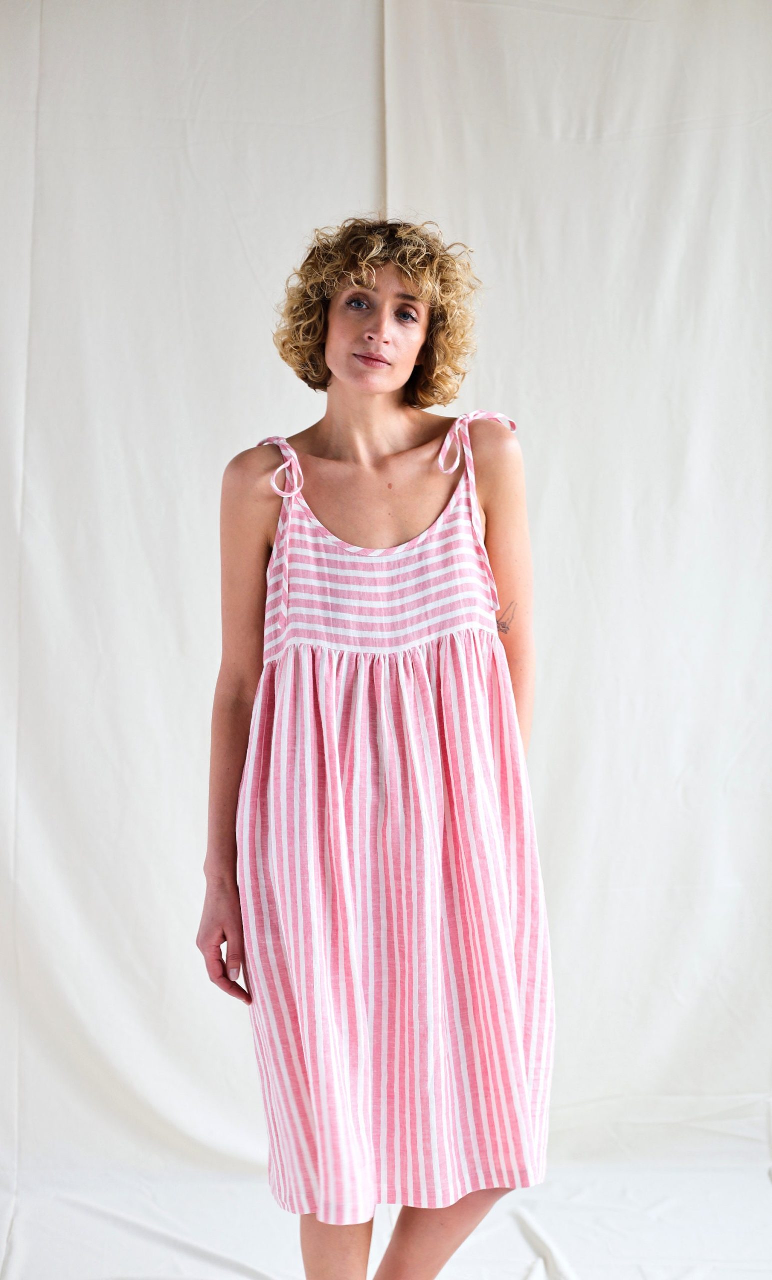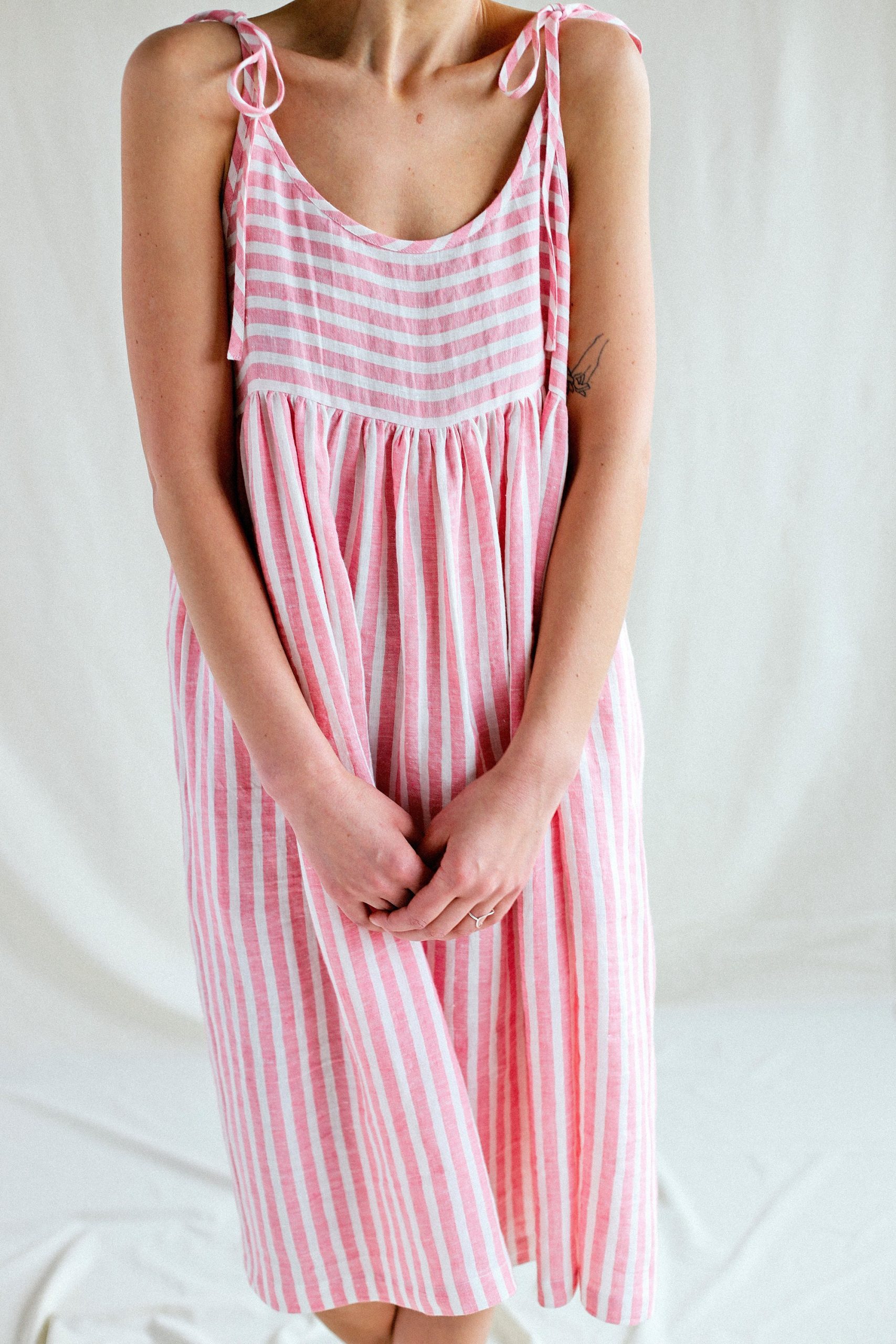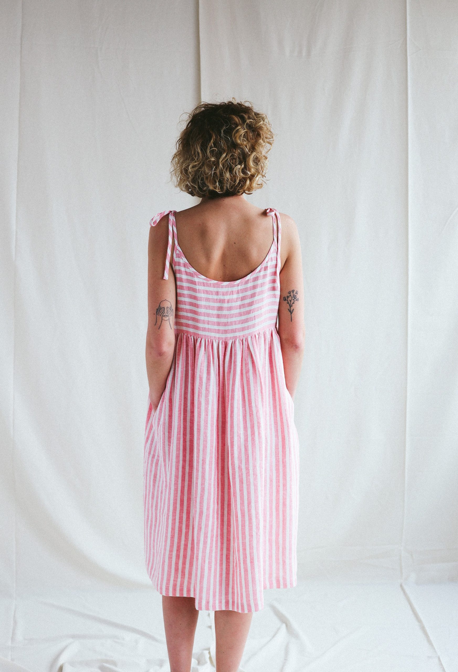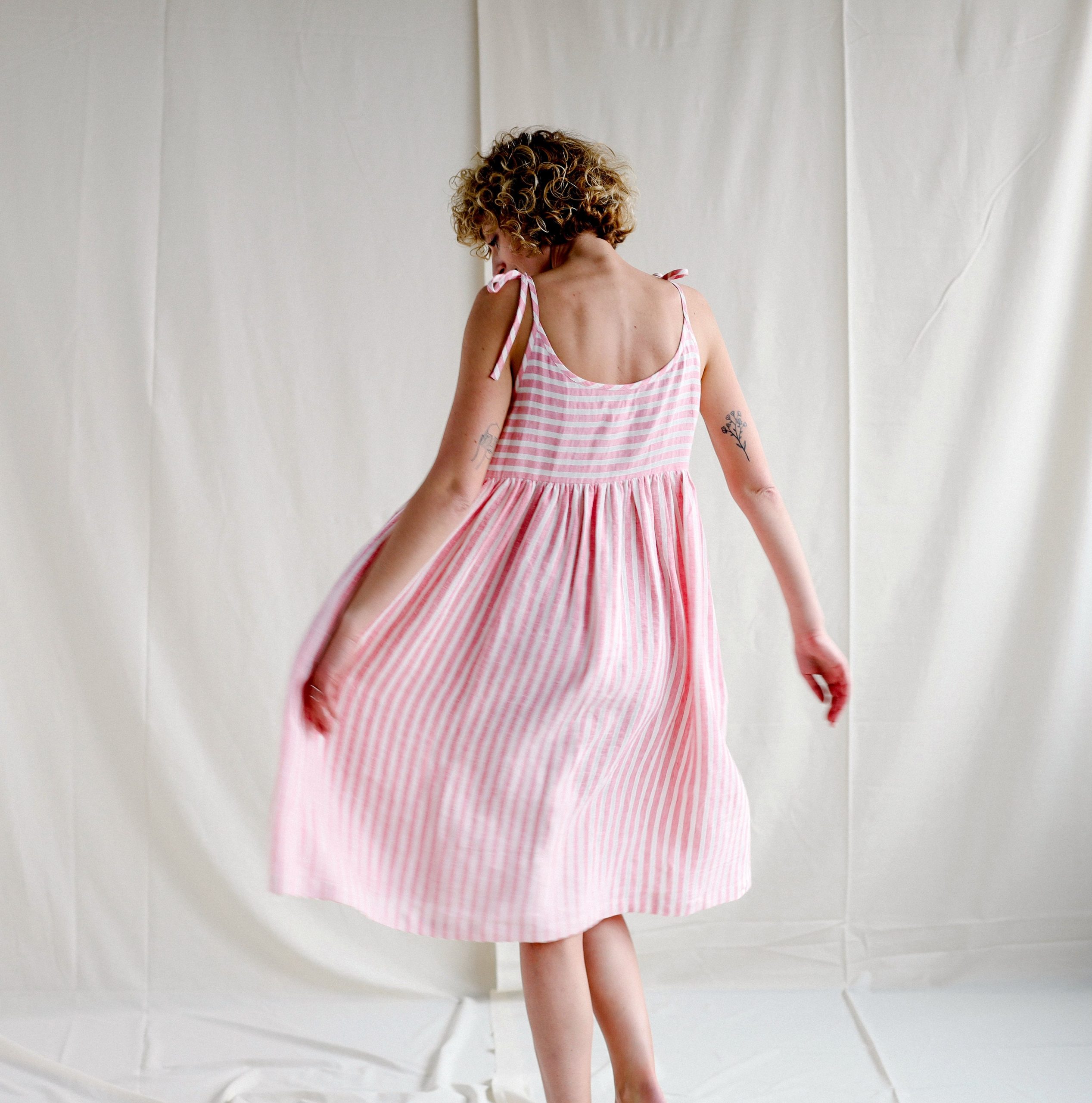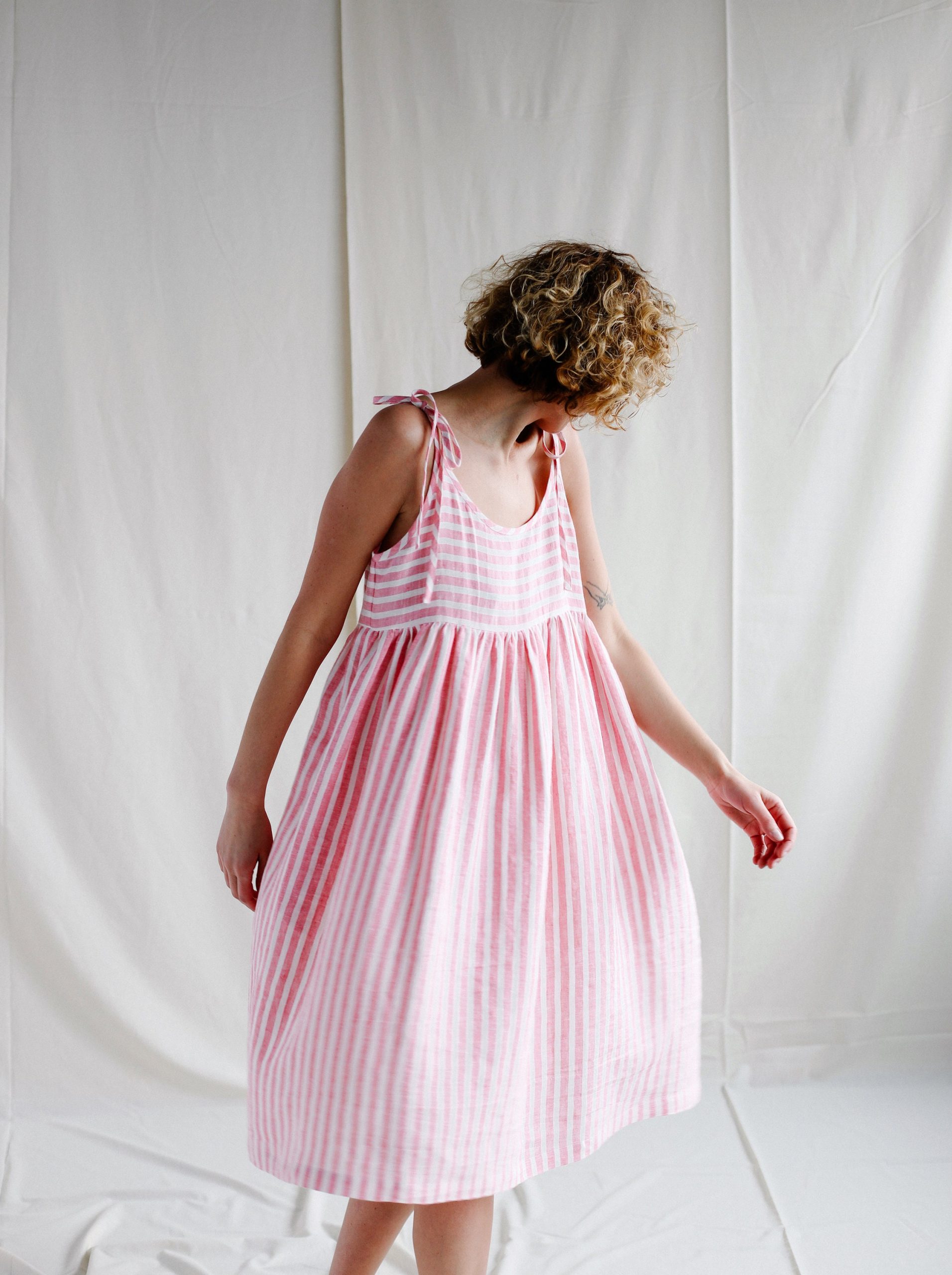 Simona is wearing white & pink linen dress in size S and is 172 cm/5’8″ tall.