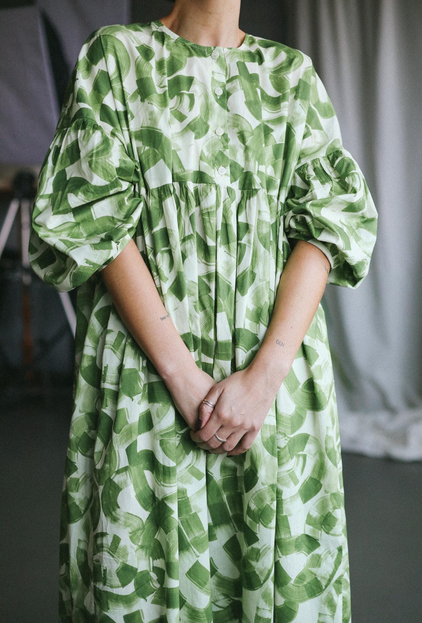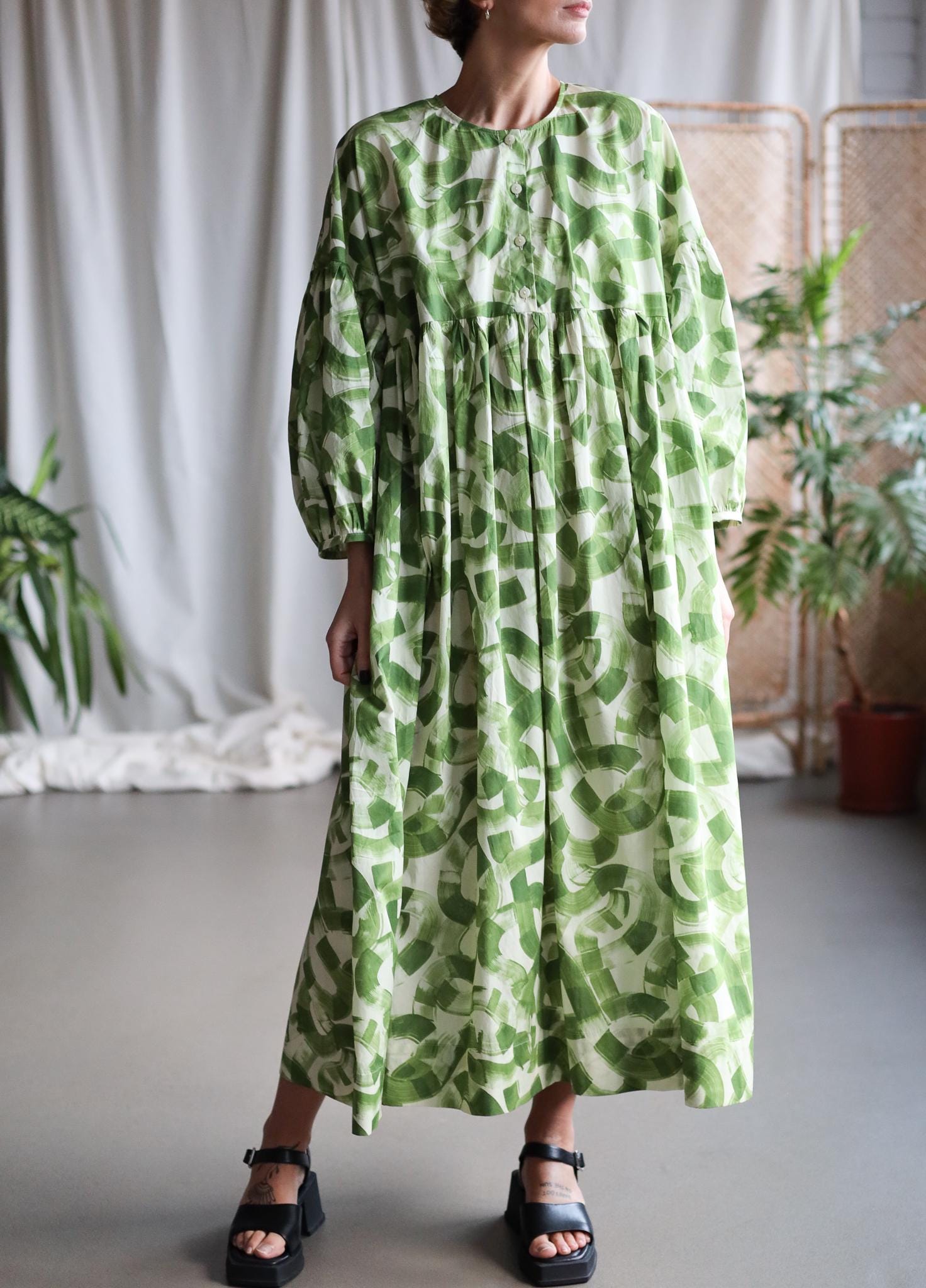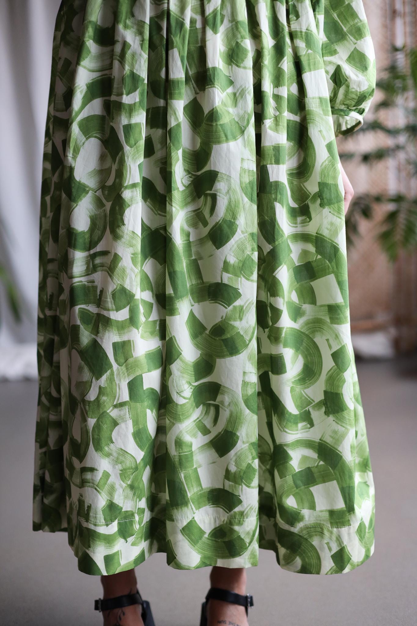 Longer version of your favorite GRETA dress. Made in a beautiful abstract green and white print silky Tana Lawn® cotton. Easy to wear, elegant, and feminine look. Perfect dress for a special occasion or to wear every day.