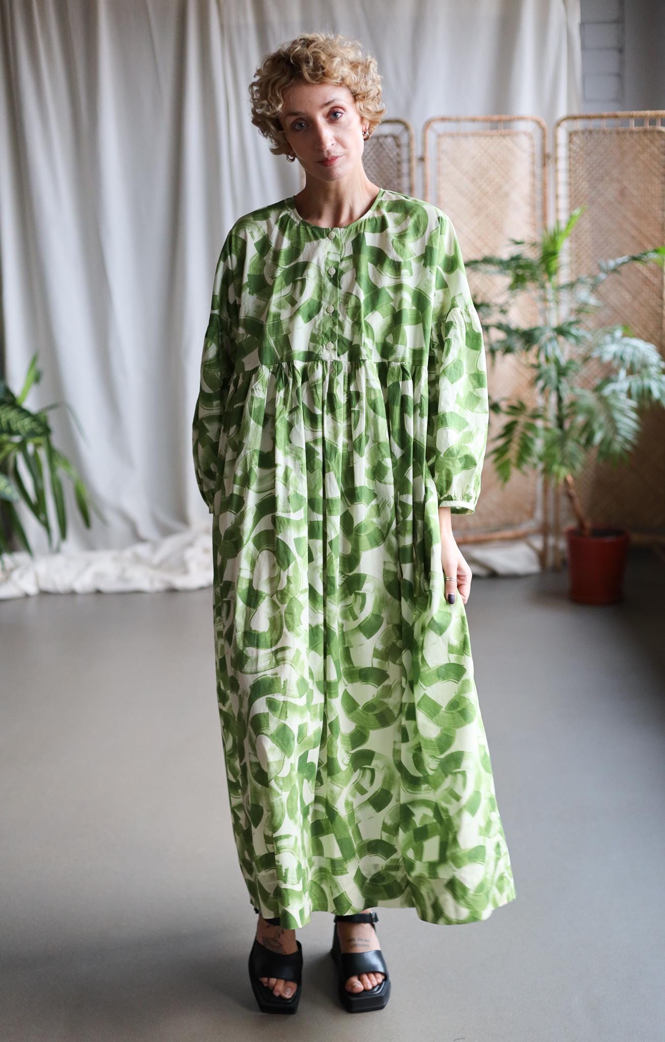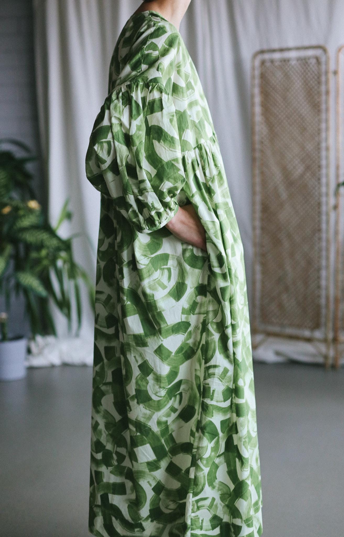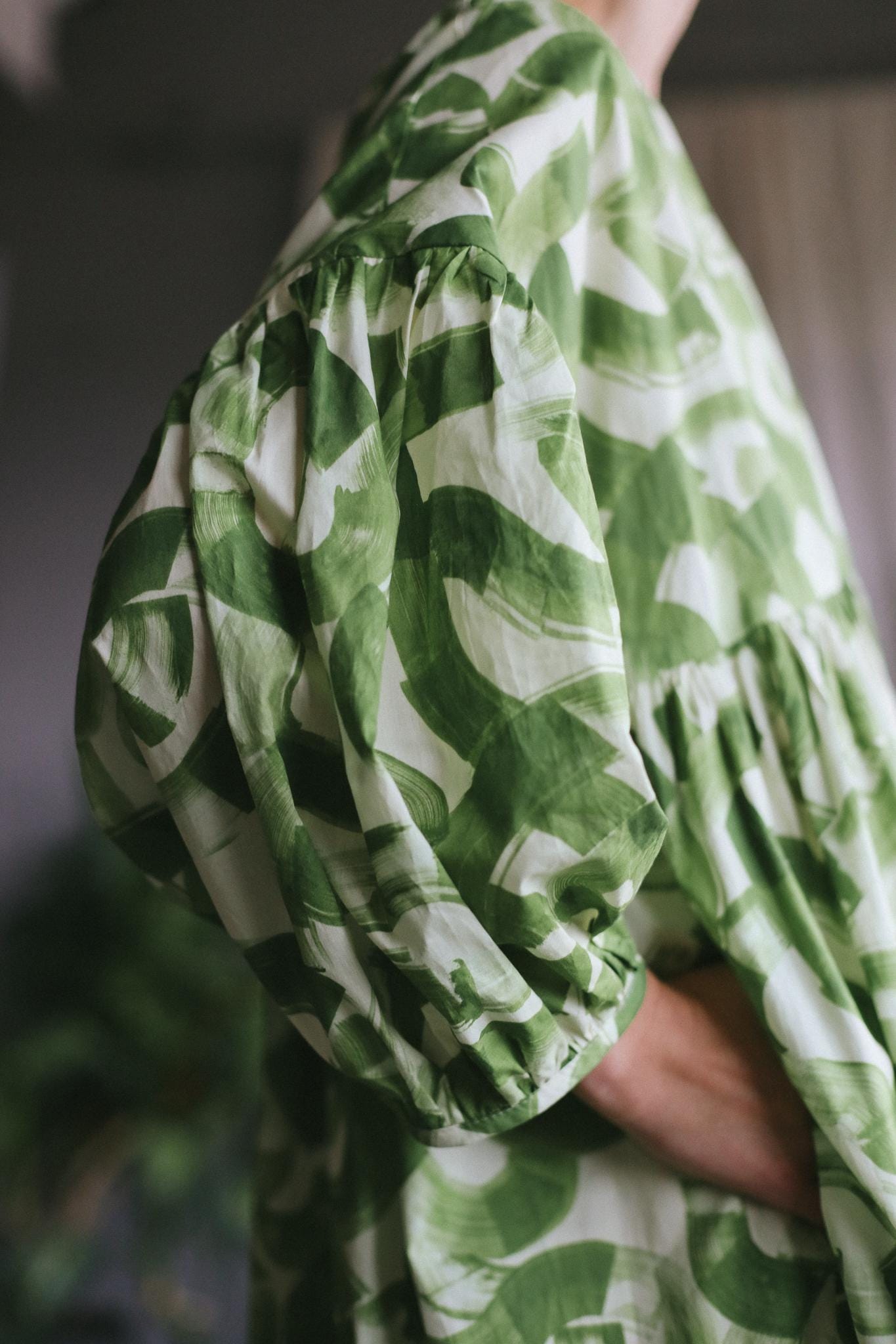 Longer version of your favorite GRETA dress. Made in a beautiful abstract green and white print silky Tana Lawn® cotton. Easy to wear, elegant, and feminine look. Perfect dress for a special occasion or to wear every day.