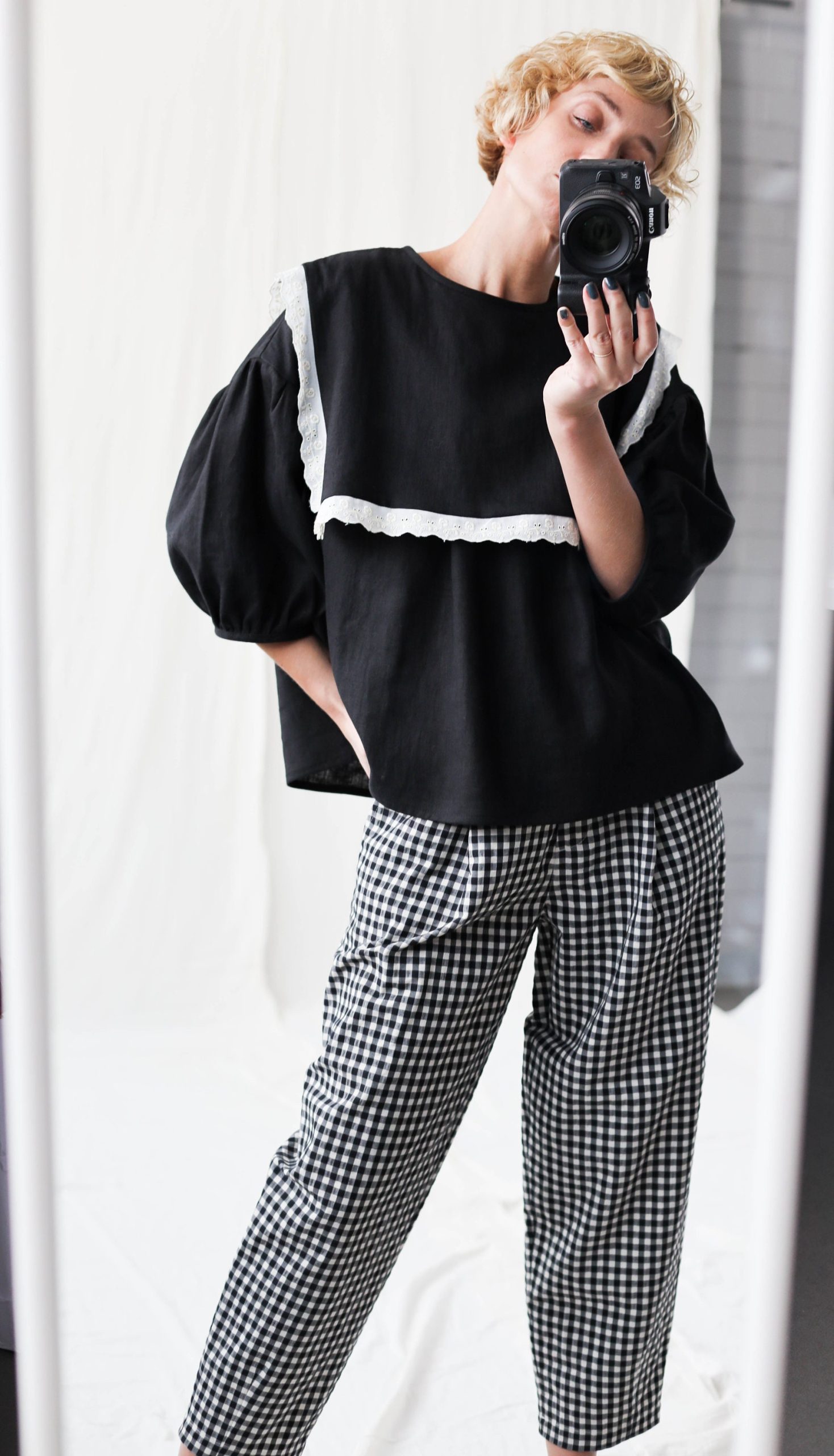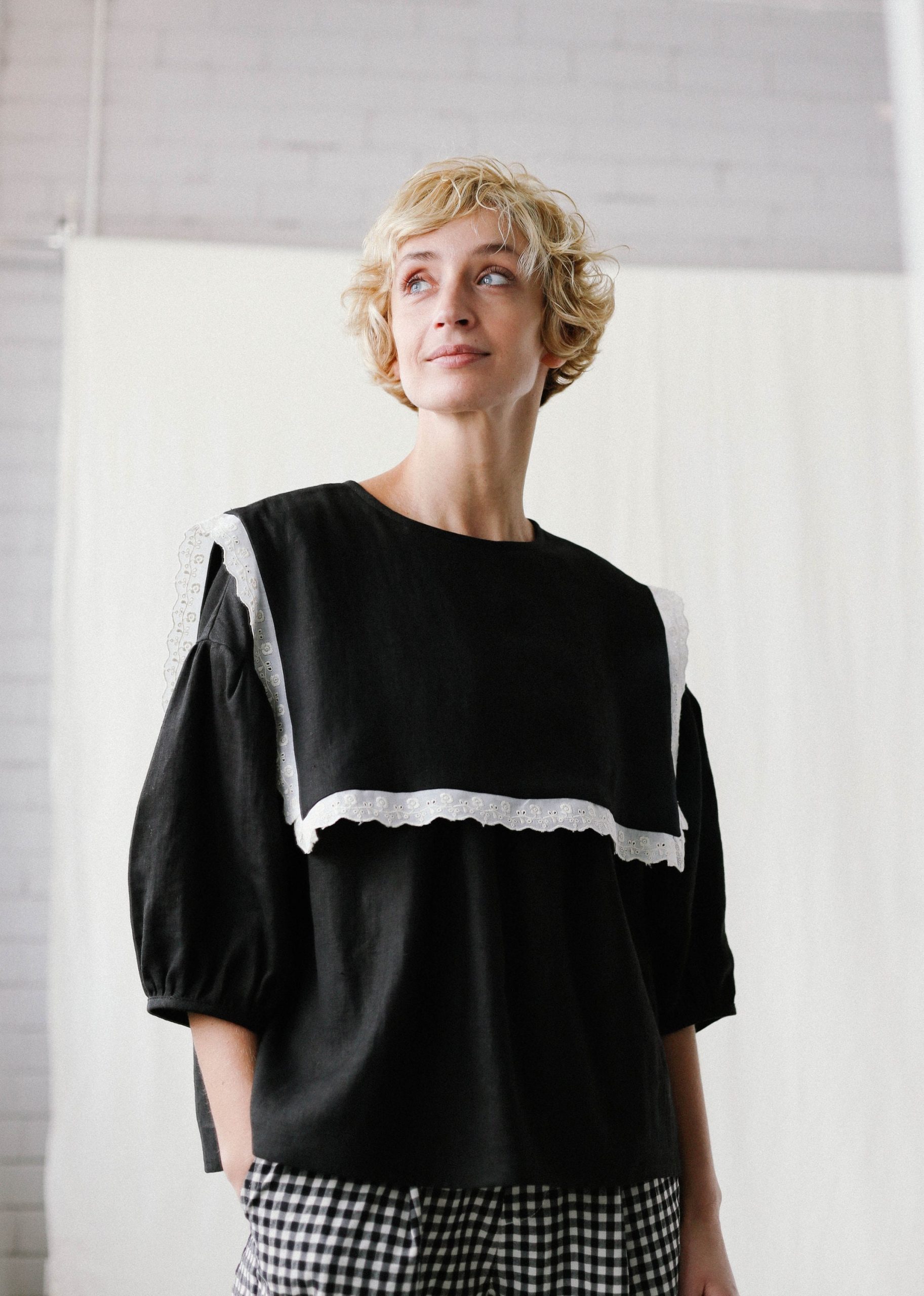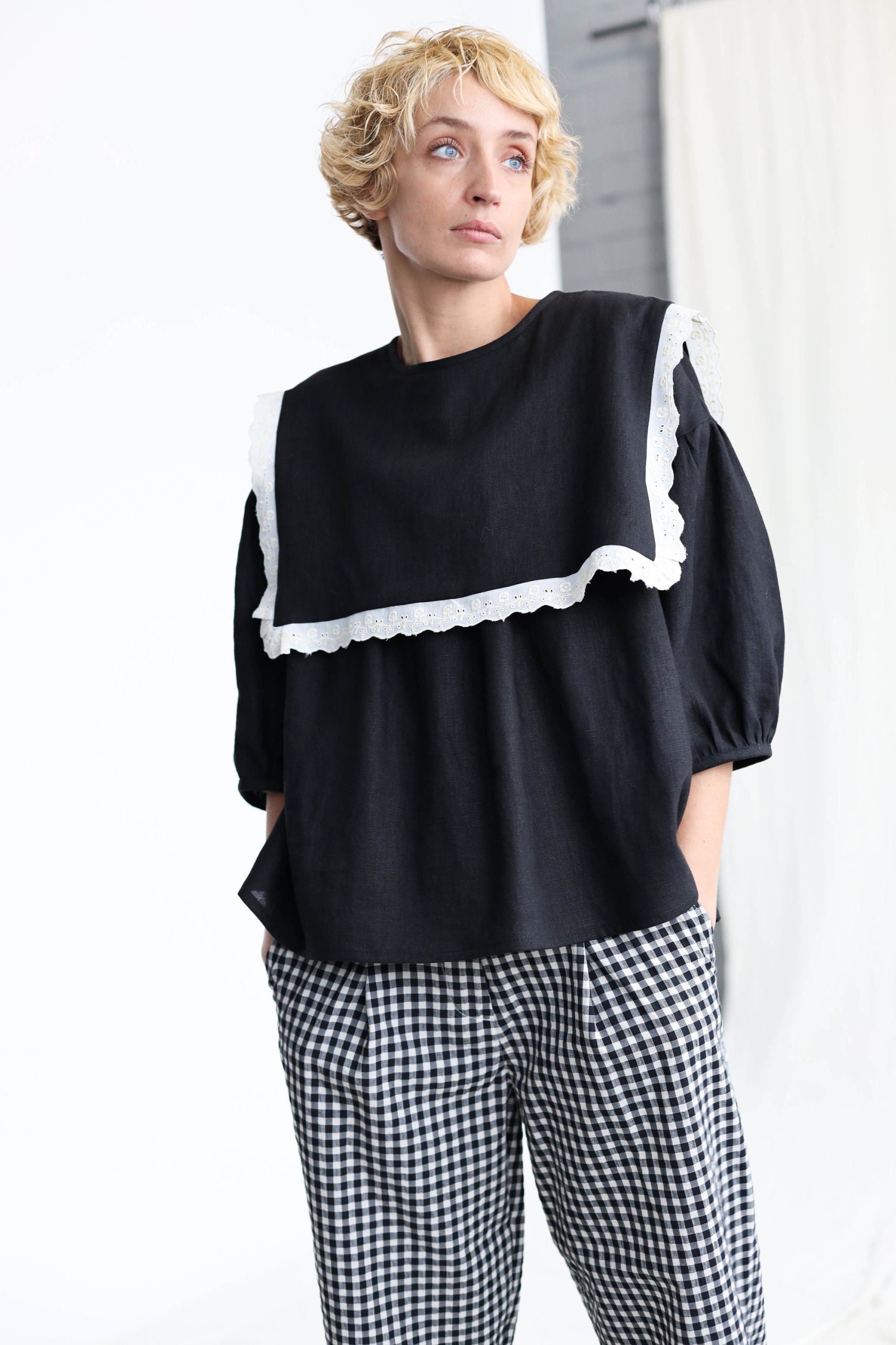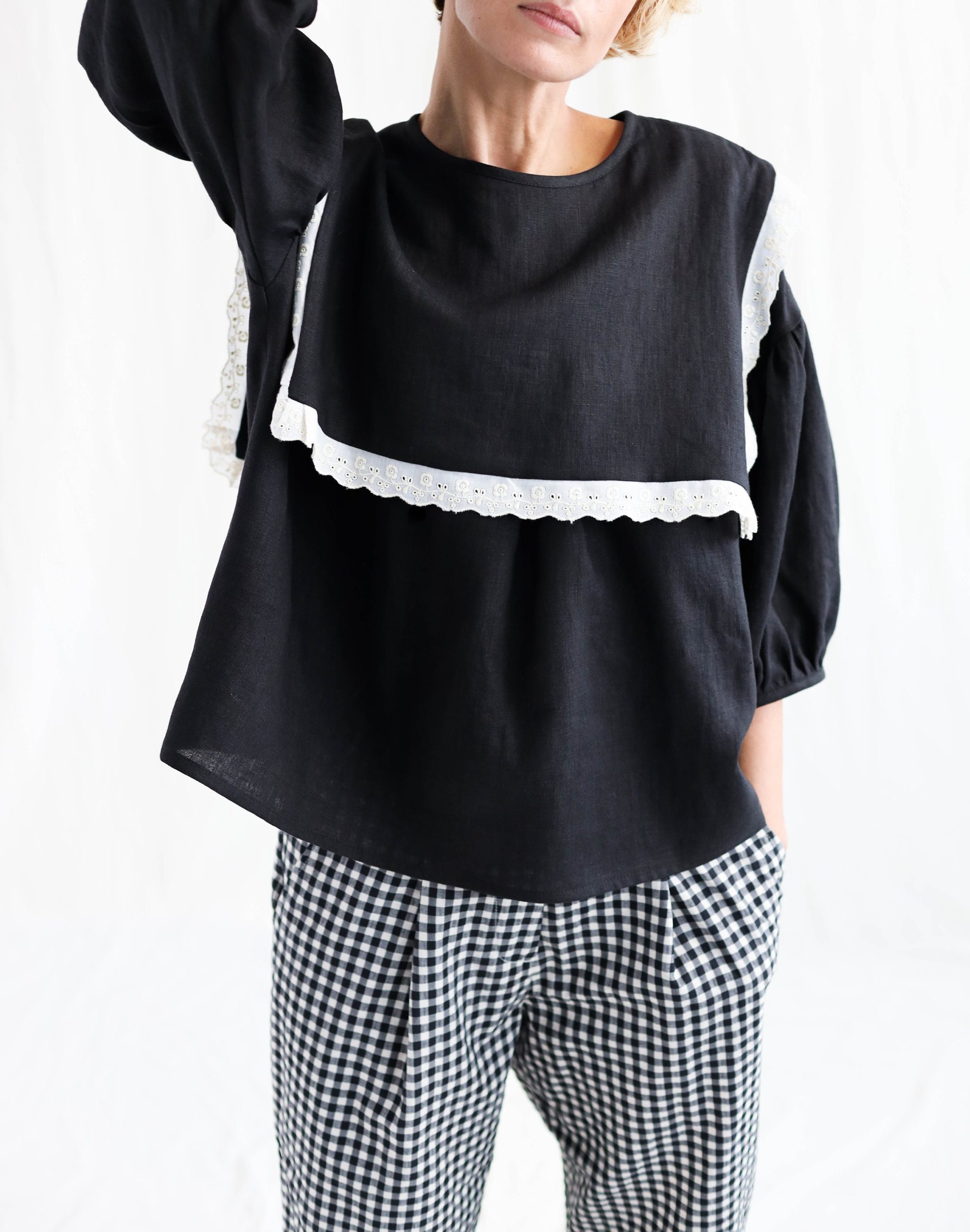 Simona is wearing an black linen blouse in size S and is 172 cm/5’8″ tall. The style of the blouse is oversized, for a more fitted look we recommend choosing one size down.