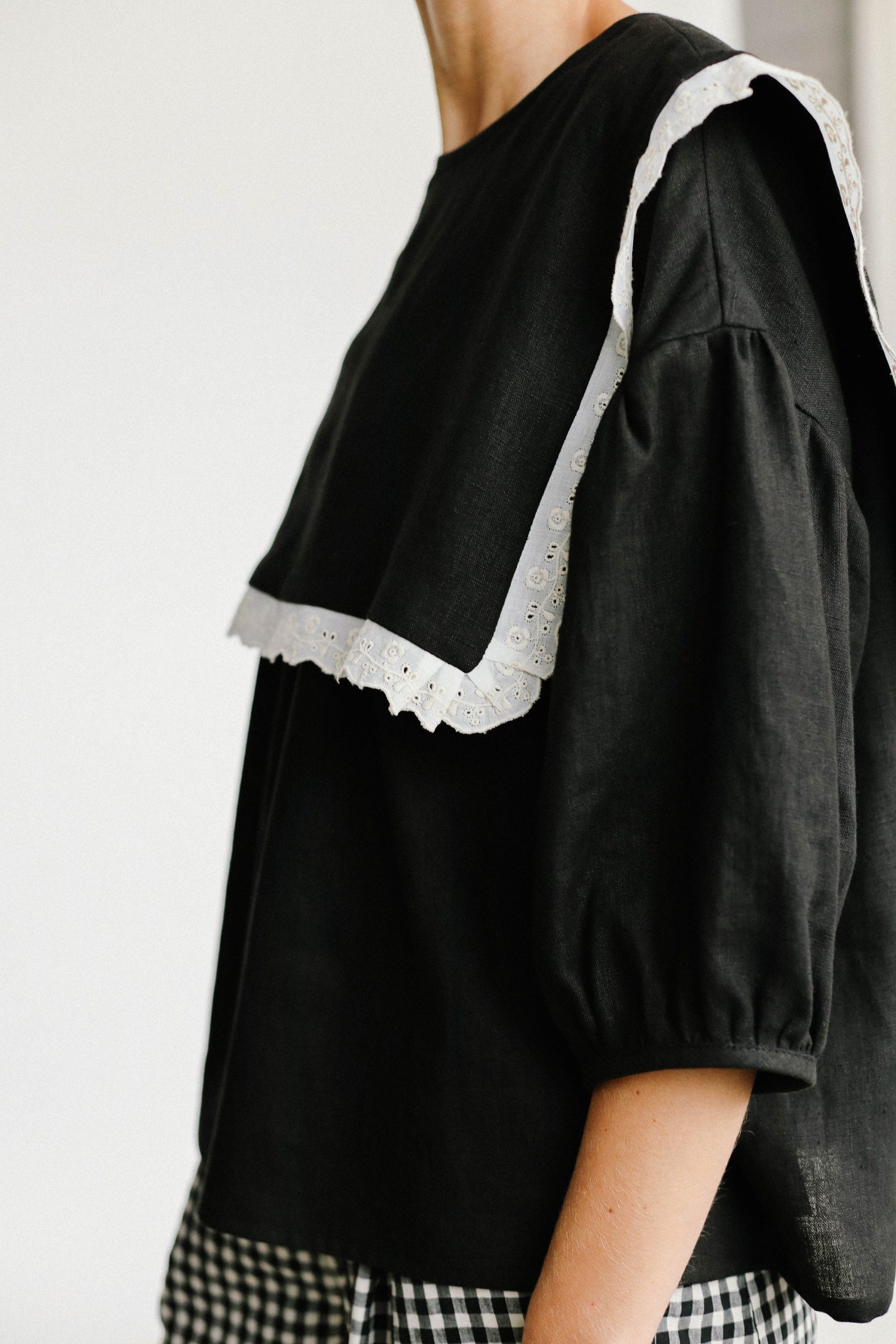 • Oversized square collar with a hemmed lace