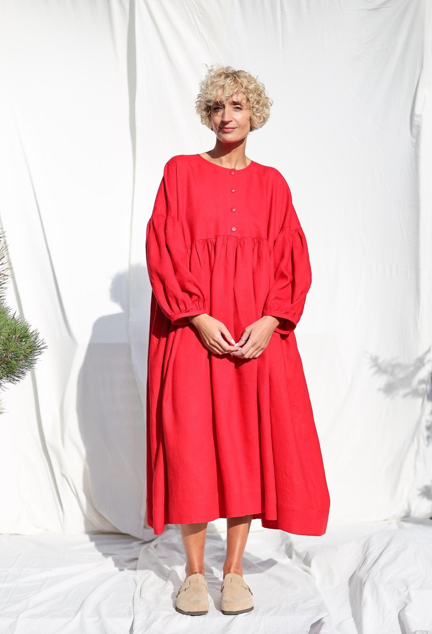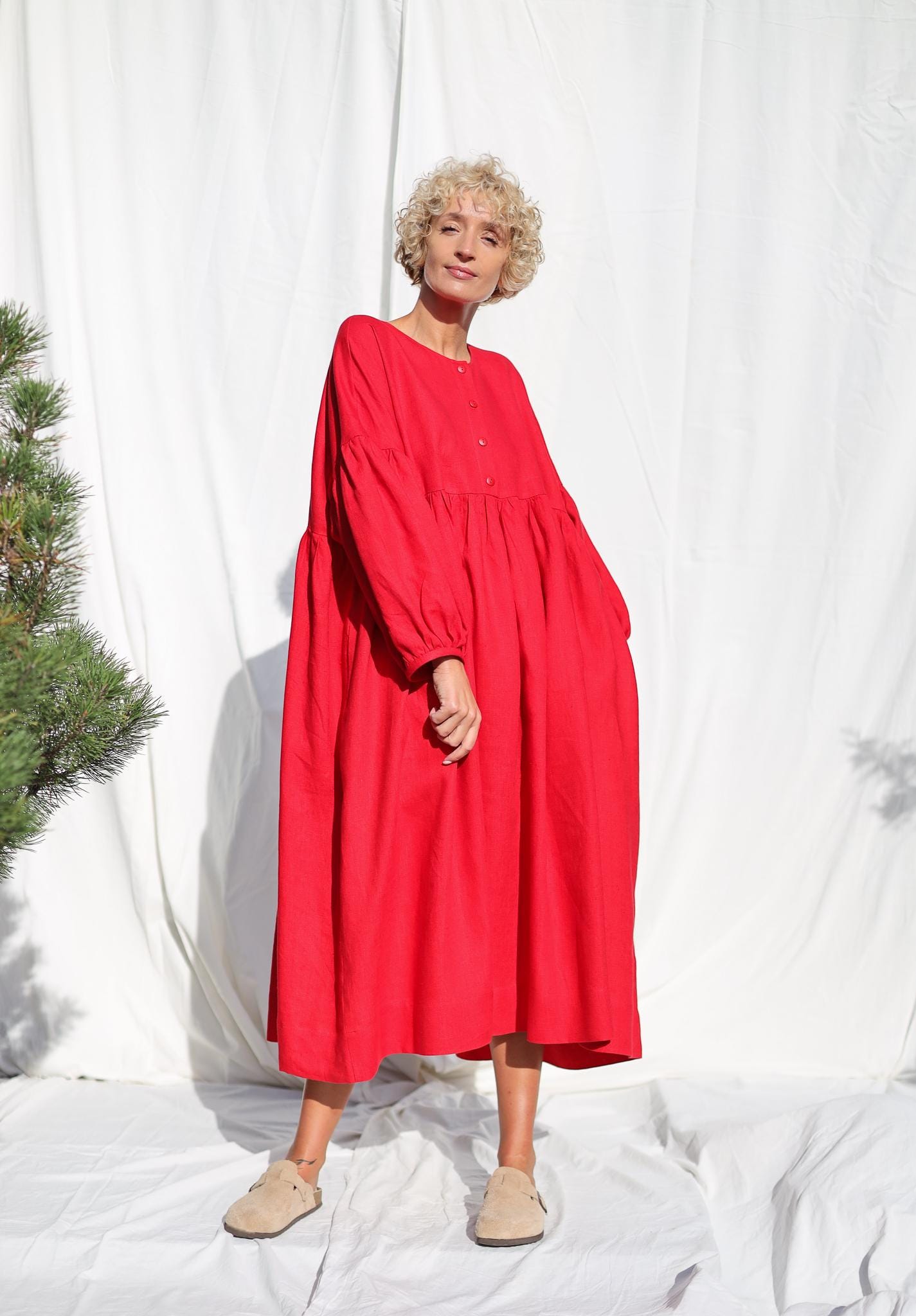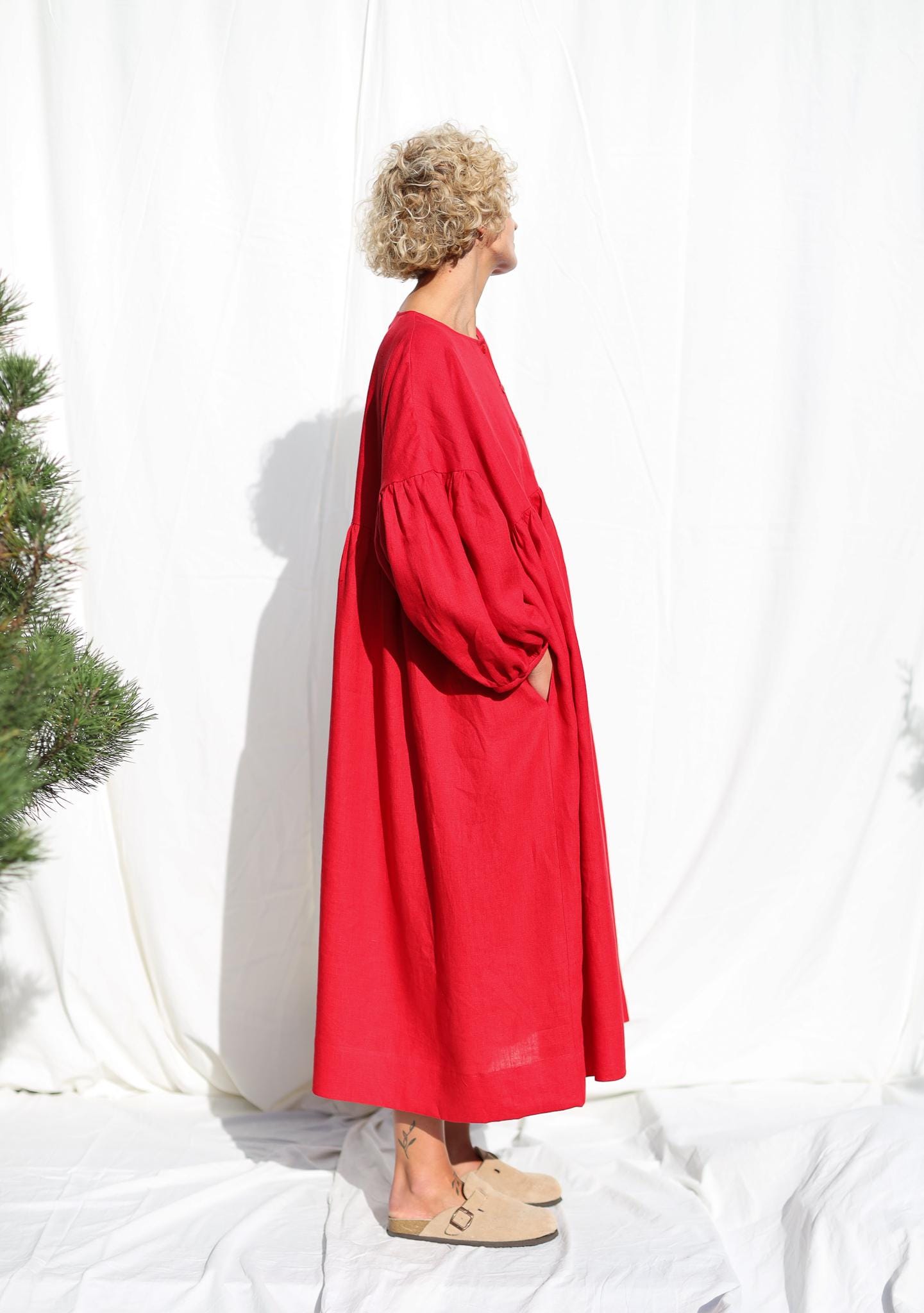 Red Linen Oversized Voluminous Sleeves Dress Greta Offon
