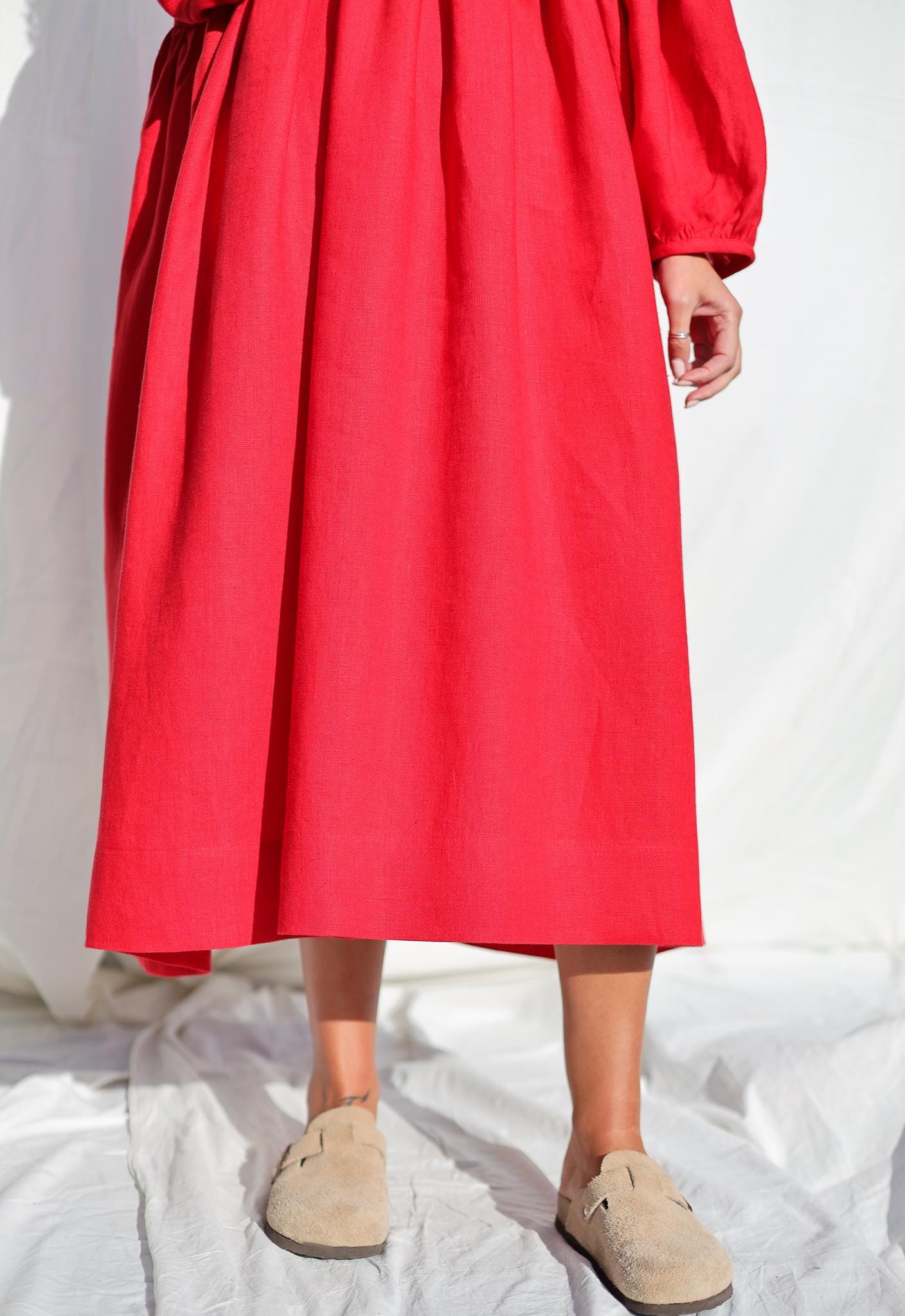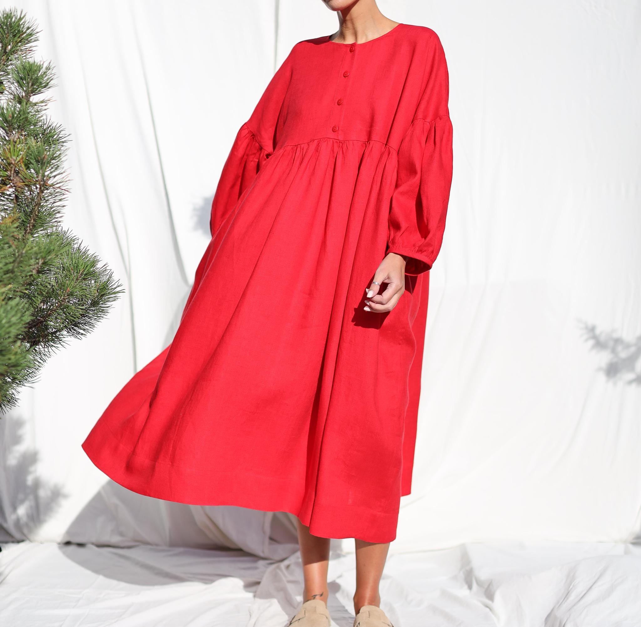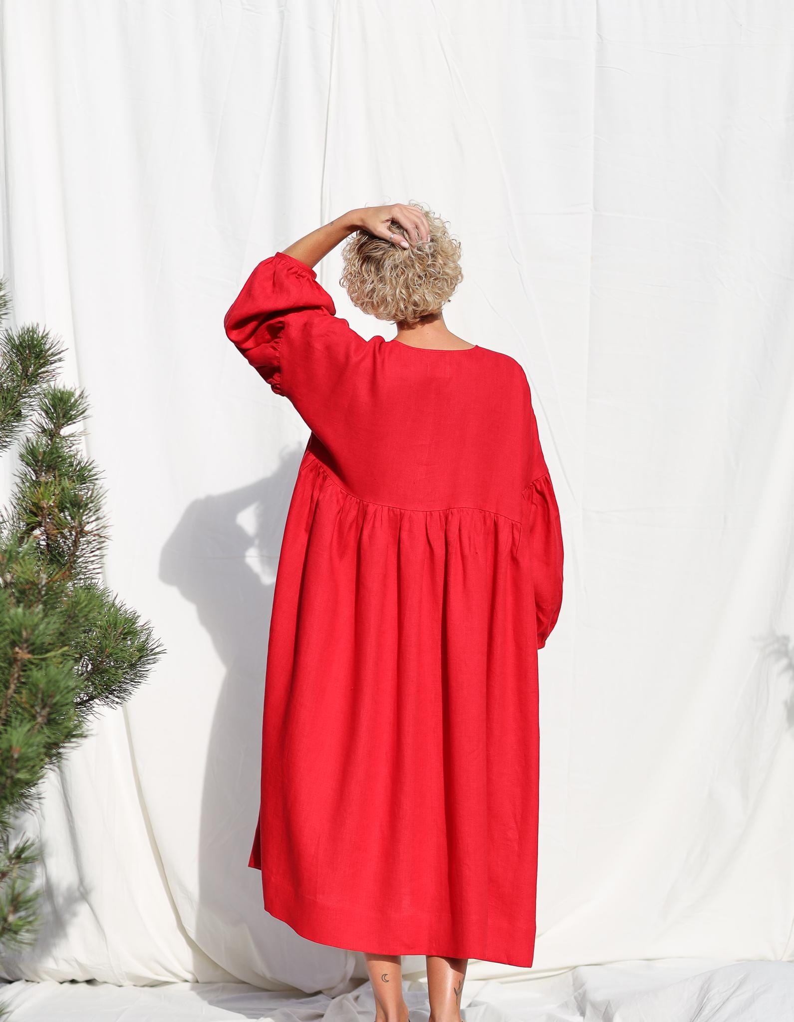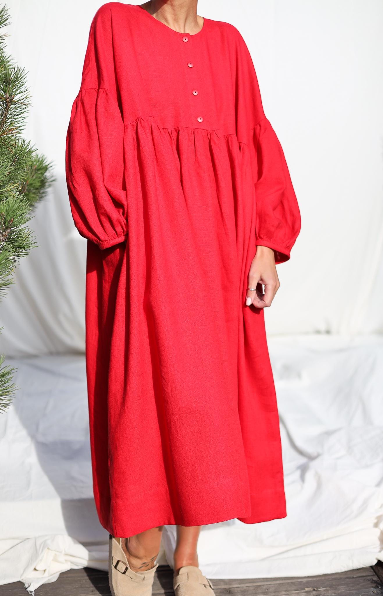 Red Linen Oversized Voluminous Sleeves Dress Greta Offon